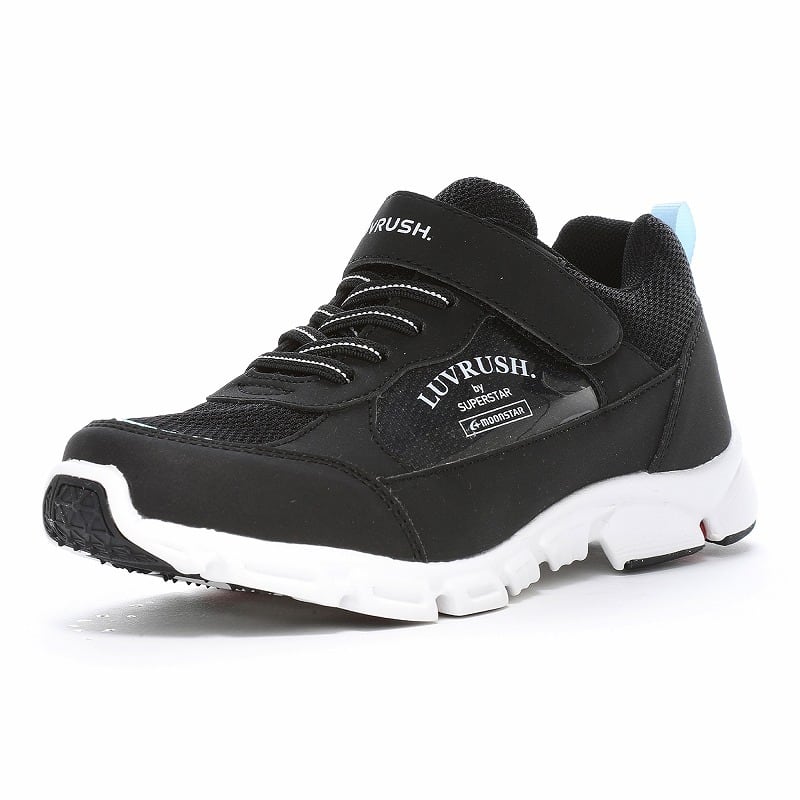 「もっと可愛く!もっと速く!女の子のスポーツシーンを足元から応援!」をコンセプトに誕生したムーンスターのガールズ向けブランド「ラブラッシュ バイ スーパースター」の幅広3Eジュニアシューズです。急な雨でも足元を快適に過ごせる防水タイプ(4cm4時間防水)です。「速く走る」を体現するために搭載されたパワーバネが走りをアシストします。重さは21.0cmで片足約175gです。